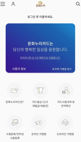 앱 다운로드 : 스마트폰에 문화누리카드 앱 설치하고